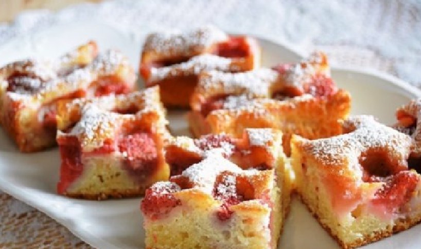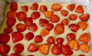 - Coprire il modulo con carta o grasso con olio. Versare l’impasto spalmare le fragole sopra, spremendo delicatamente le bacche nell’impasto. Cuocere cinquanta minuti a 180 gradi.