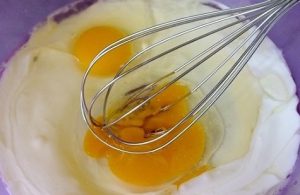 - Mescolare olio vegetale, panna acida, uova, normale e zucchero vanigliato. Basta mescolare fino a che liscio, non sbattere necessario.