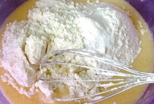 - Aggiungi il lievito e la farina. Mescolare.
