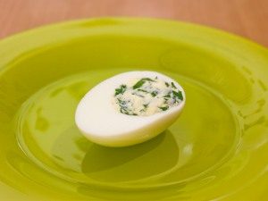 - Lavare le uova, far bollire sodo, raffreddare in acqua fredda. Sbucciare, tagliare in due metà.