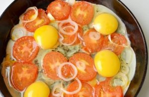 - Cipolla con pomodori tagliati a cerchi. Scaldiamo la padella con burro, cipolle sparse e pomodori.