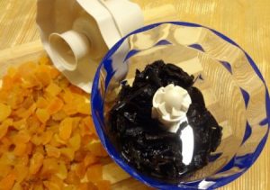 - Sciacquiamo le prugne secche e le albicocche secche e le aggiungiamo al composto. Aggiungi fibra. Macina tutto bene e lascialo in pace una decina di minuti.