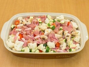- Metti tutto in una teglia, leggermente oliato ingredienti, aggiungere sale e pepe, spezie a piacere, mescolare.