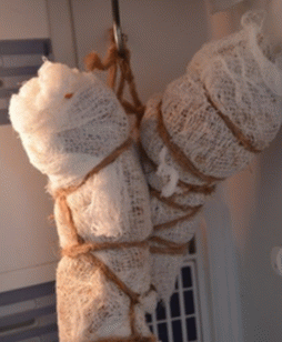 - Strofina accuratamente la carne con un composto. Avvolgilo in pochi strati di garza, ma non molto stretti, la carne dovrebbe respirare.