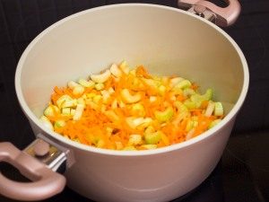 - In una padella da quattro litri, olio vegetale friggere le cipolle tritate.