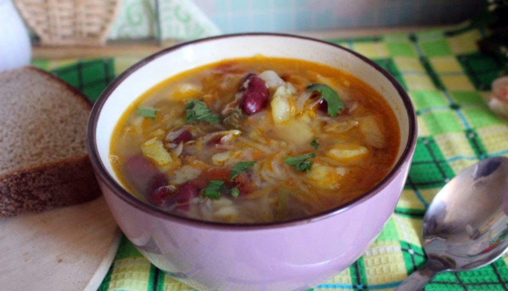 - Metti il condimento nella zuppa insieme ai fagioli in scatola. Spargiamo pepe, foglia di alloro nella zuppa. Cucinare lentamente sparare per 15-20 minuti.