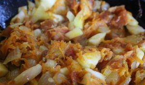 - Friggere le carote e le cipolle in una padella con burro, metterle a loro pomodori tritati, friggere per 5 minuti e aggiungere piccoli pezzi mela. Cuocere altri 5 minuti.