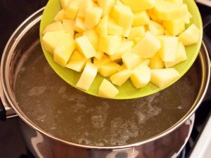 - Sbucciare le patate, tagliarle a barrette, mettere in acqua bollente insieme alla foglia di alloro.