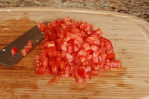 - Aggiungere i pomodori tritati finemente e cuocere a fuoco lento per circa 5 minuti.
