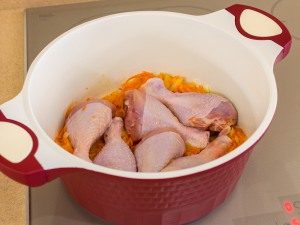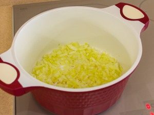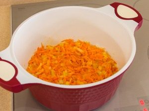 - Friggere le cipolle tritate in una casseruola (4 litri), aggiungere ad esso le carote, grattugiate su una grattugia media, friggere insieme, mescolando ogni tanto.
