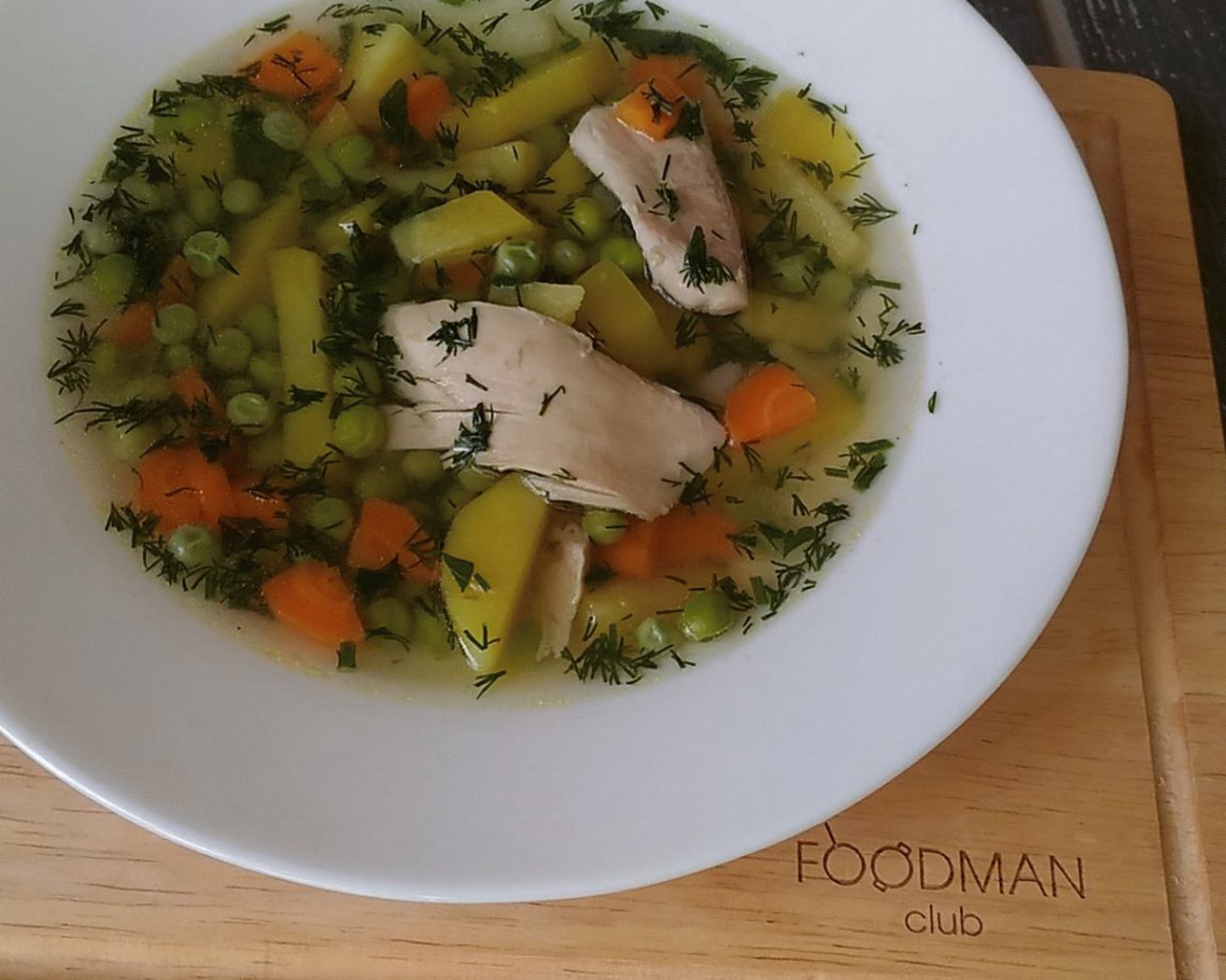 Congelo personalmente i piselli dal giardino, è molto dolce e gustoso, Aggiungo molto ad esso. E il bambino mangia una tale zuppa con piacere.