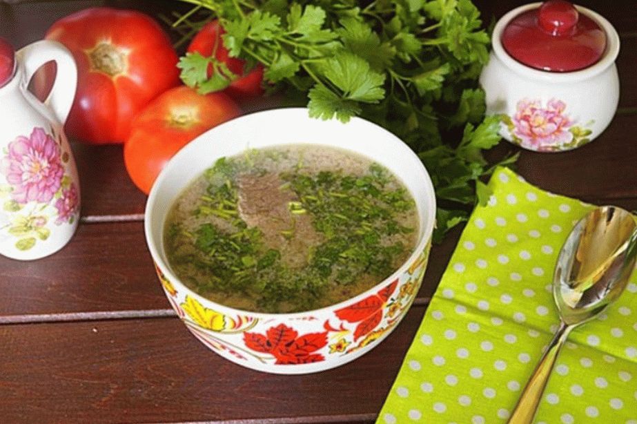 - Mettere la carne in una ciotola, versare la zuppa e cospargere con trito finemente verdi.