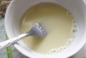 - Strofina il tuorlo d’uovo e mescolalo con un mestolo freddo brodo.