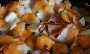 - Metti le cipolle tritate con le carote alla pancetta, passante, aggiungi carne affumicata tritata e friggere tutti insieme per 4-6 minuti.